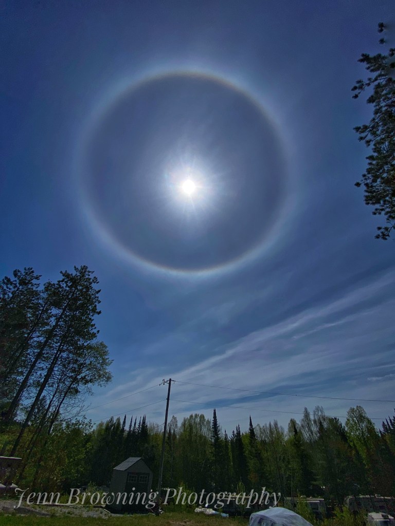 This weekend seemed to fly by in the blink of an eye. We are home now for more treatment this week but we can’t wait to return again soon. As we were packing up, our friend told us to go outside and look at the sun. We braved the bugs and went out to see what she was talking about. I looked up and saw the most amazing solar halo perfectly placed in the open sky. This is just one small example of why I love our life up North!